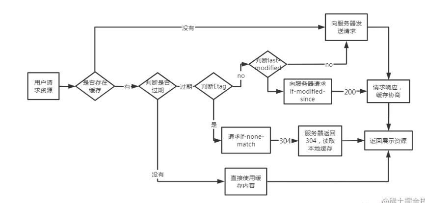 协商缓存就是强制缓存失效后,浏览器 携带缓存标识 向服务器发起请求,由服务器根据缓存标识决定是否使用缓存的过程,同样协商缓存的标识也是在响应报文的HTTP头中和请求结果一起返回给浏览器的,控制协商缓存的字段分别有:Last-modified/If-modified-since 和etag/if-none-match,,其中Etag / If-None-Match的优先级比Last-Modified / If-Modified-Since高